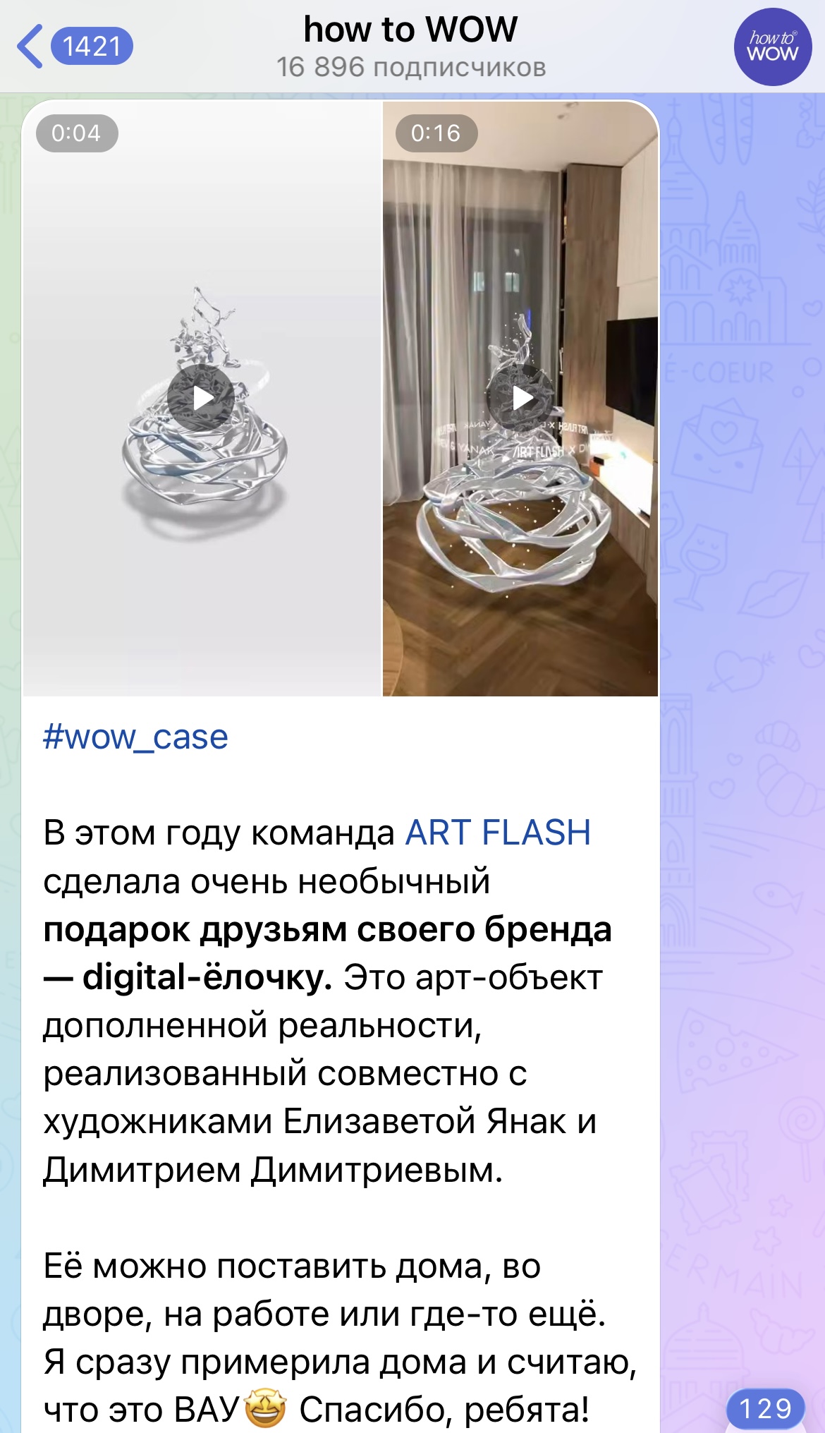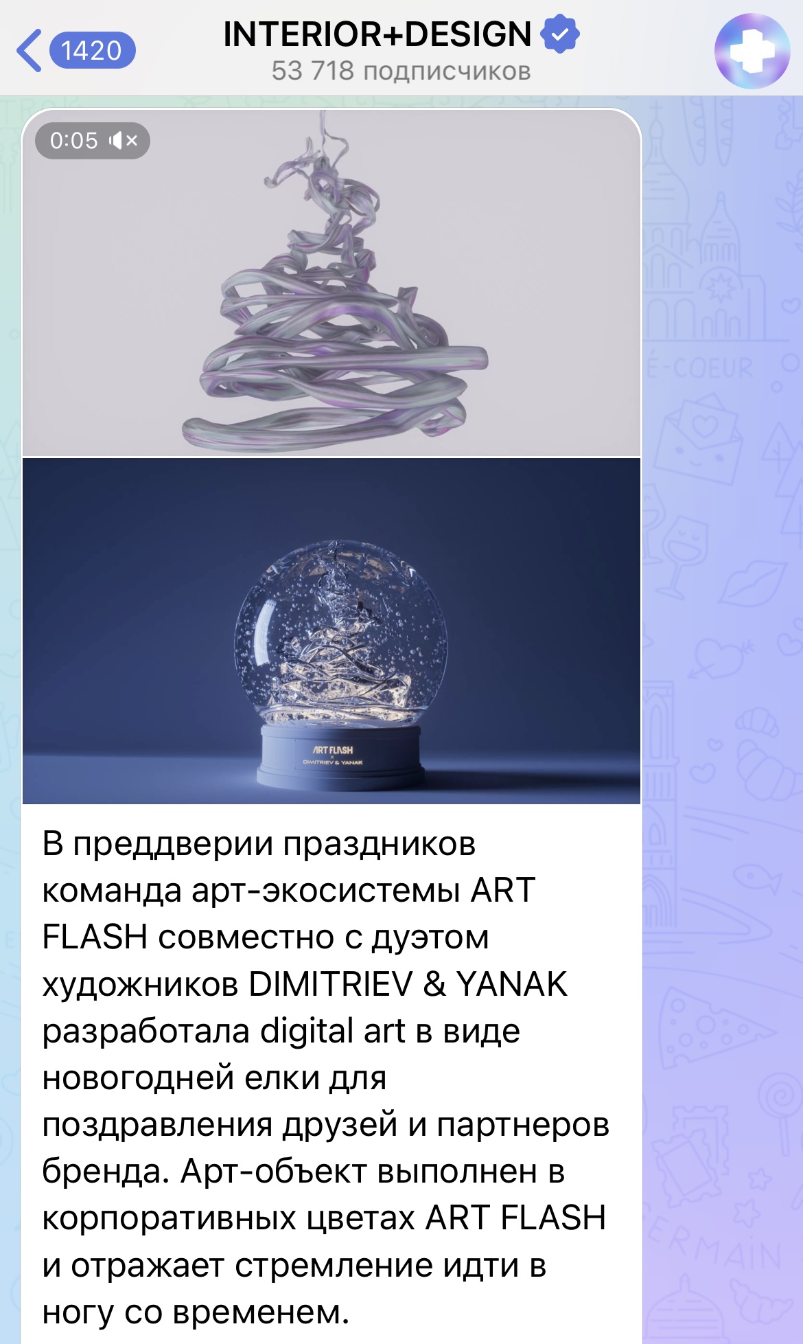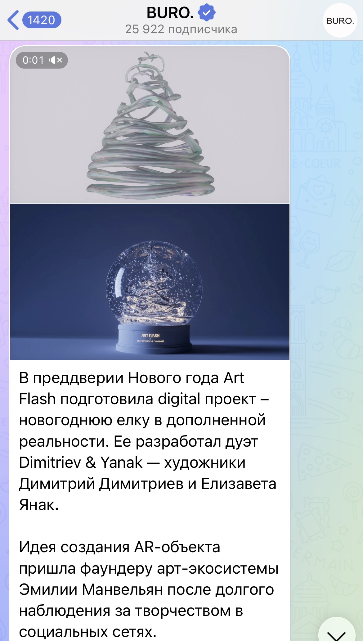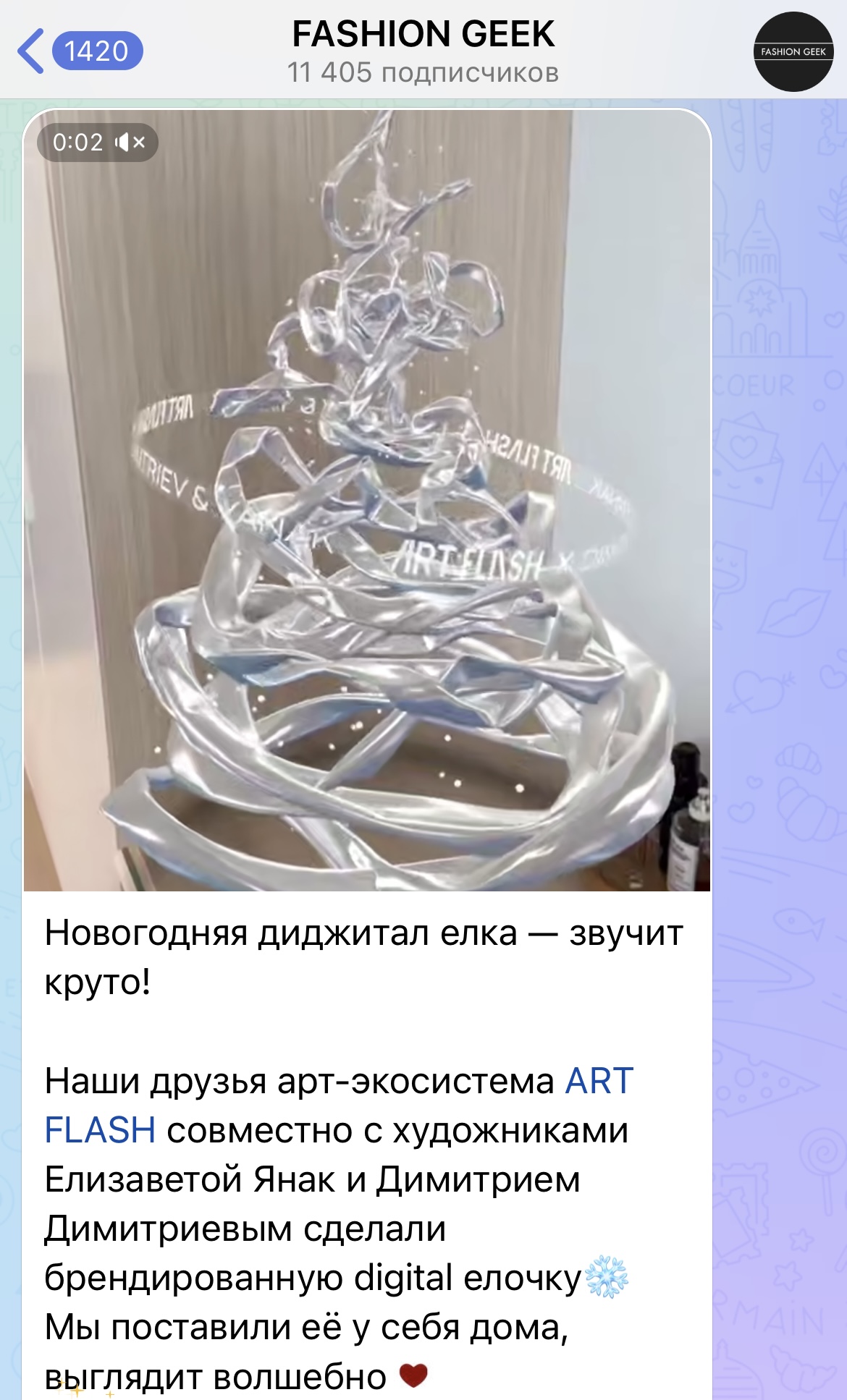 «Один раз мне пришла мысль сделать что-то совместное. А мы как раз искали идеи для новогоднего поздравления. Вместе мы придумали разработать digital-елочку. Почему мы это придумали и почему именно такая ёлка? Как вы видите, сами цвета елки достаточно спокойные и монохромные. При этом она всё равно переливается и блестит, создавая праздничное настроение. В этом есть отсылка к нашим корпоративным цветам бренда, поскольку именно этот оттенок — переливающийся серебристый, фиолетовый — мы любим использовать в оформлении контента.